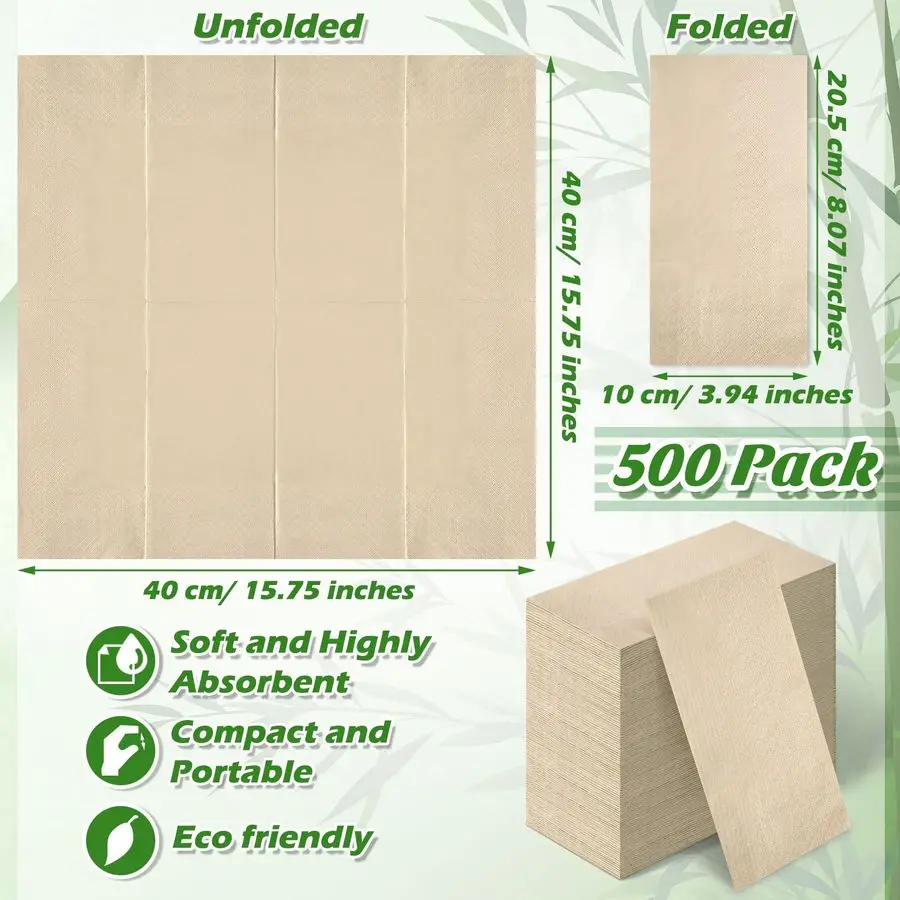 Enough to Use and Replace you will receive 500 pieces of unbleached napkins, the folded size is approx. 7.87 x 3.94 inches, the unfolded size is approx. 15.75 x 15.75 inches, enough to use, can meet your daily and party needs And the right size allows you to easily carry and use them