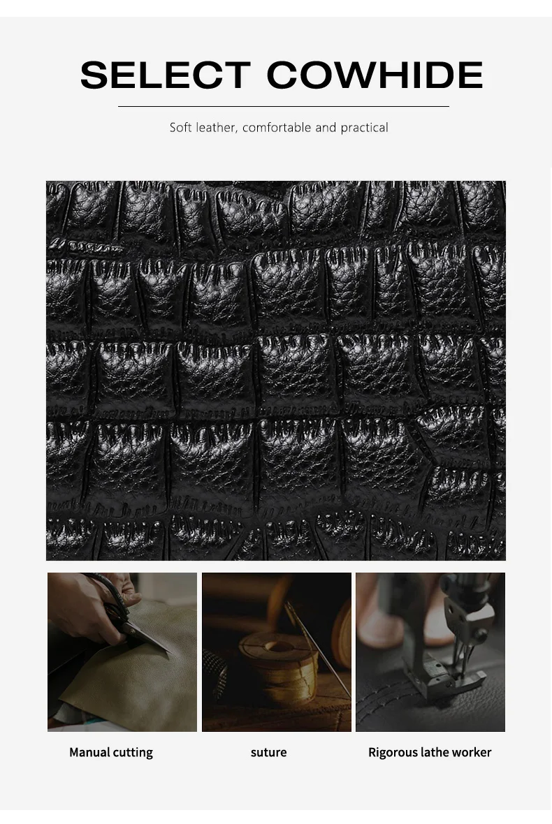 - Main material: Genuine leather (cowhide) with a crocodile-embossed pattern