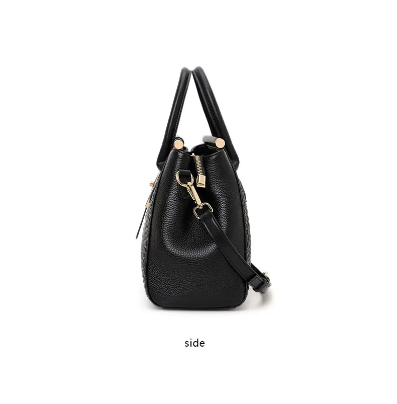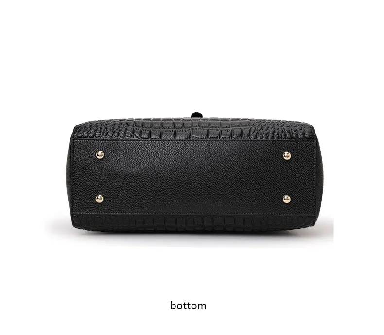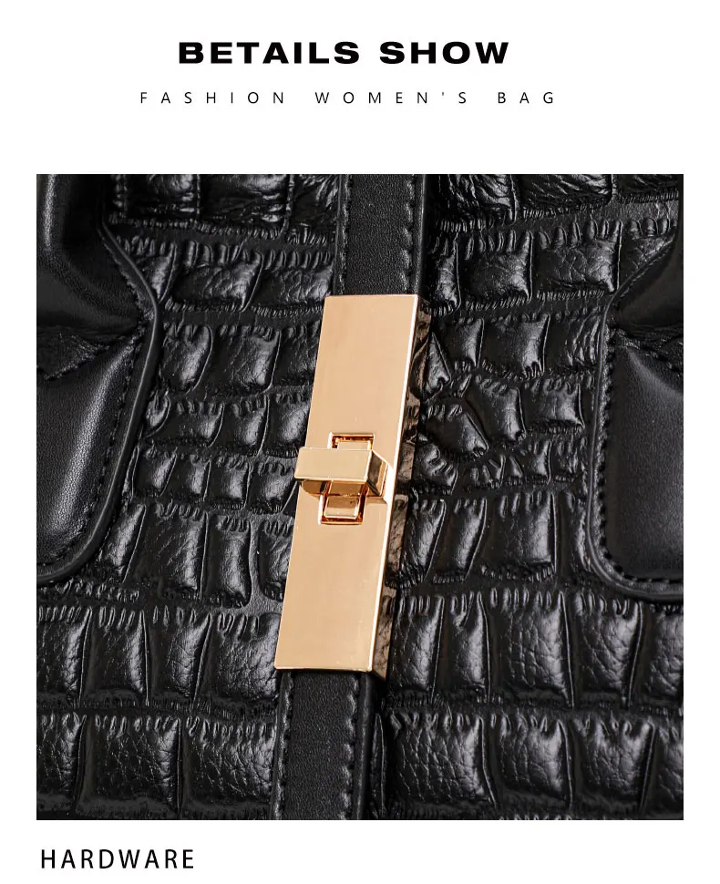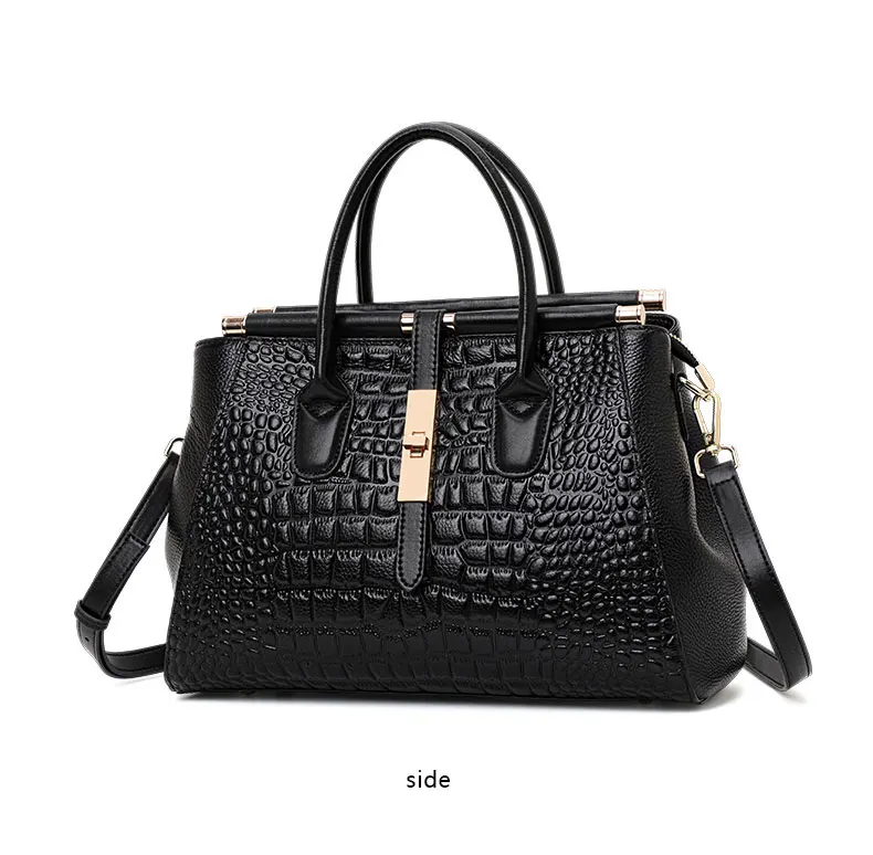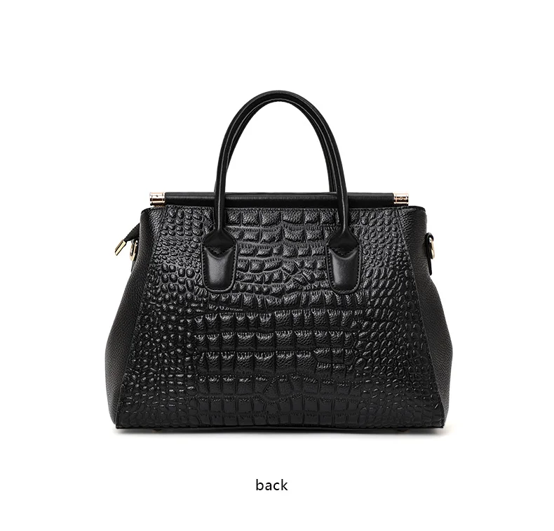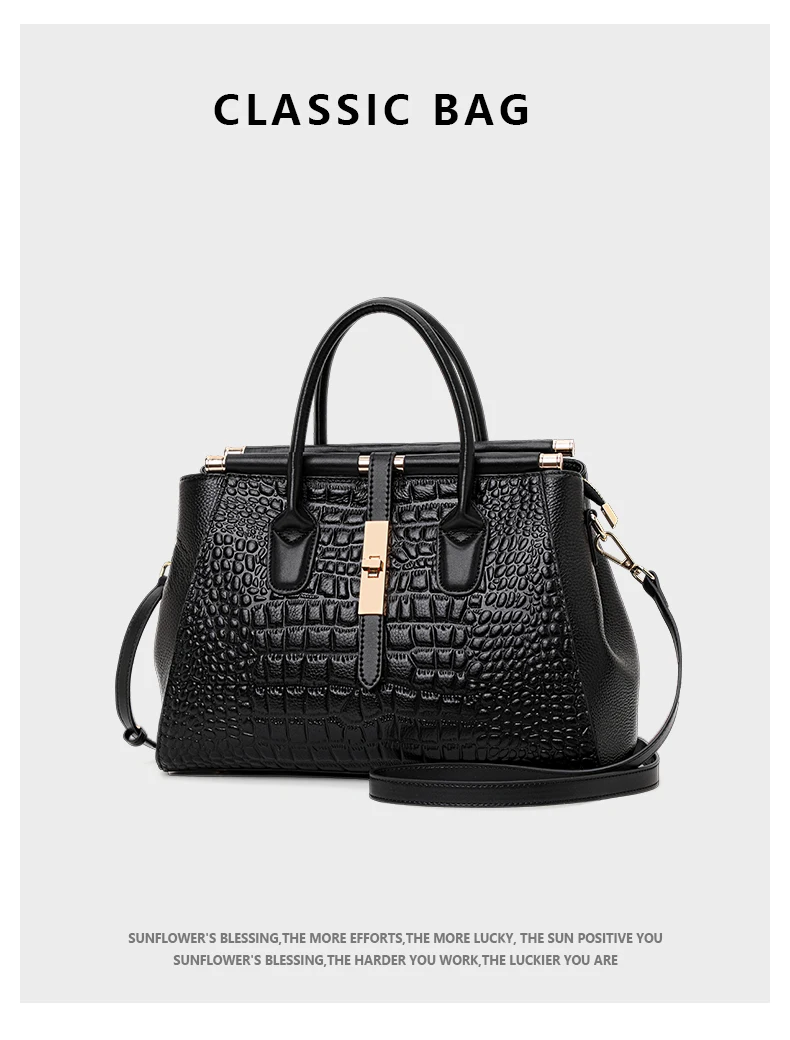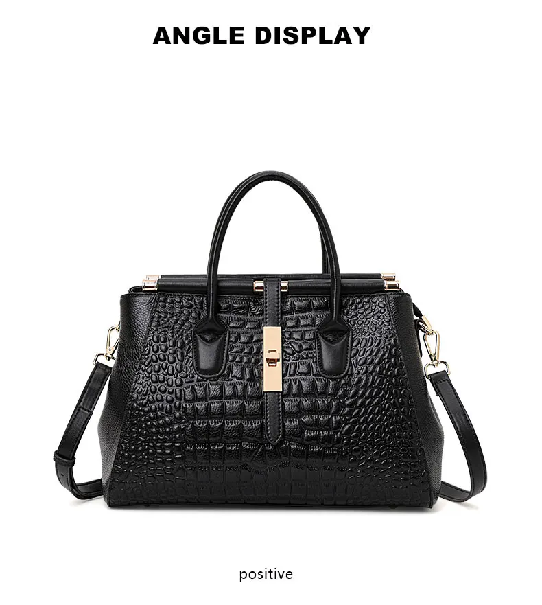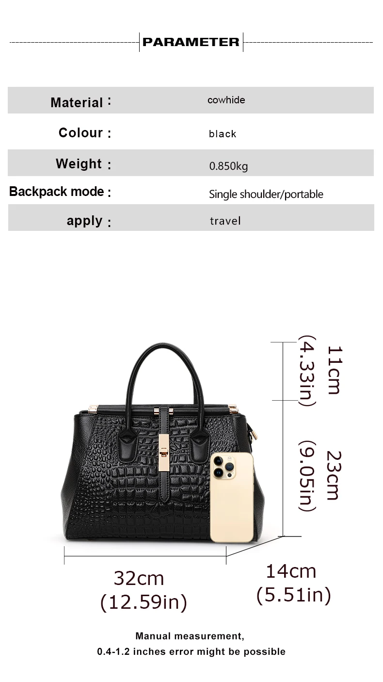 Genuine leather cowhide handbag for women, featuring a crocodile-embossed pattern. Designed for everyday use, it combines a spacious interior with a refined silhouette and a detachable shoulder strap for crossbody or shoulder wear.