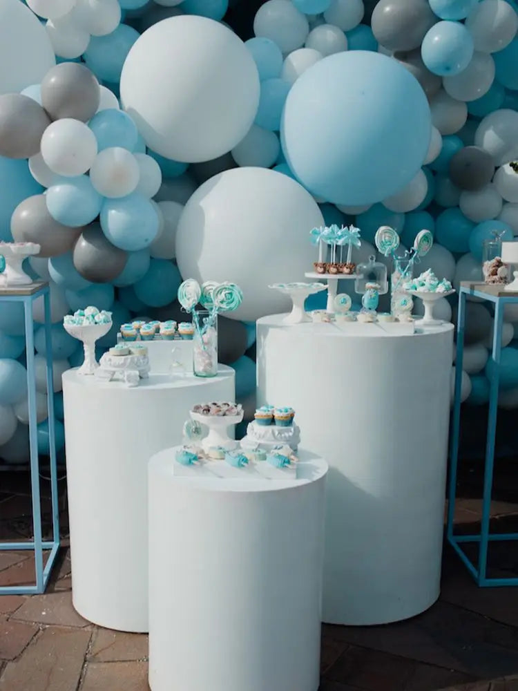- Three-piece, multi-height set: small: 27 cm diameter x 50 cm high (10.6 x 19.7 in); medium: 30 cm x 55 cm (11.8 x 21.7 in); large: 33 cm x 60 cm (13 x 23.6 in). The three pieces are designed to create a dynamic, layered display on dessert tables, floral backdrops, or cake stations.