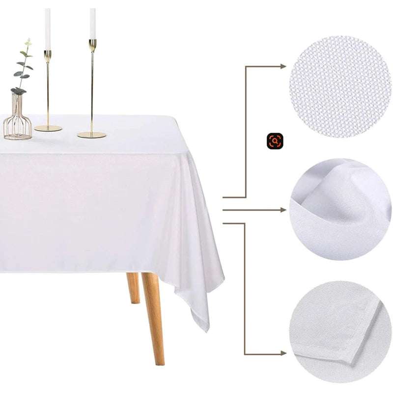 READOR 12Pcs Rectangle Tablecloths deliver a clean, timeless white look for weddings, banquets, parties, and everyday gatherings. Made from 100% polyester, these washable, reusable tablecloths protect rectangular tables while simplifying setup and cleanup.
