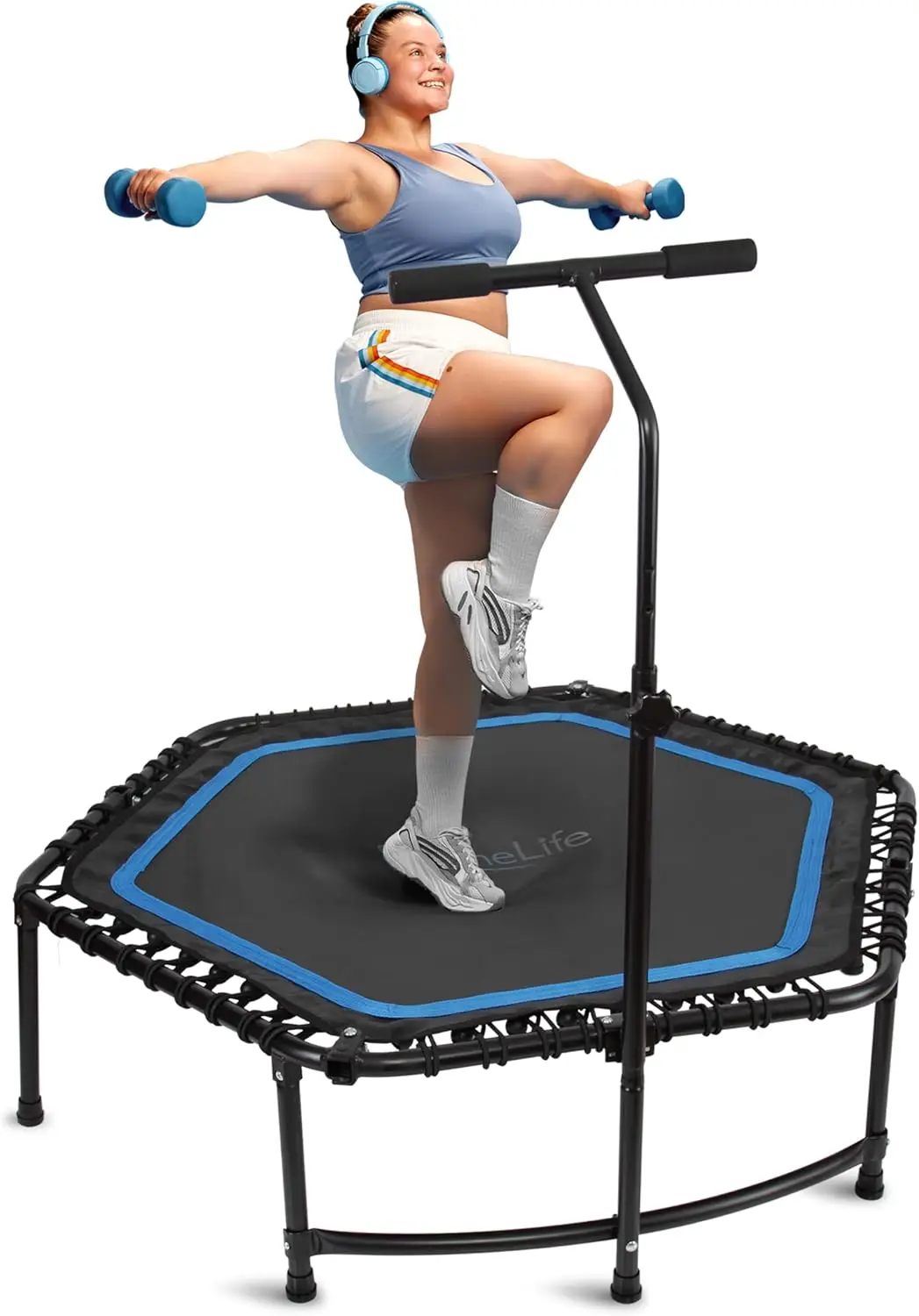 ADJUSTABLE HANDLEBAR: The mini trampoline for adults features a T- handle adjustable to 3 height levels (43.3"–51"), providing a comfortable grip and added stability for users of different ages and fitness levels.