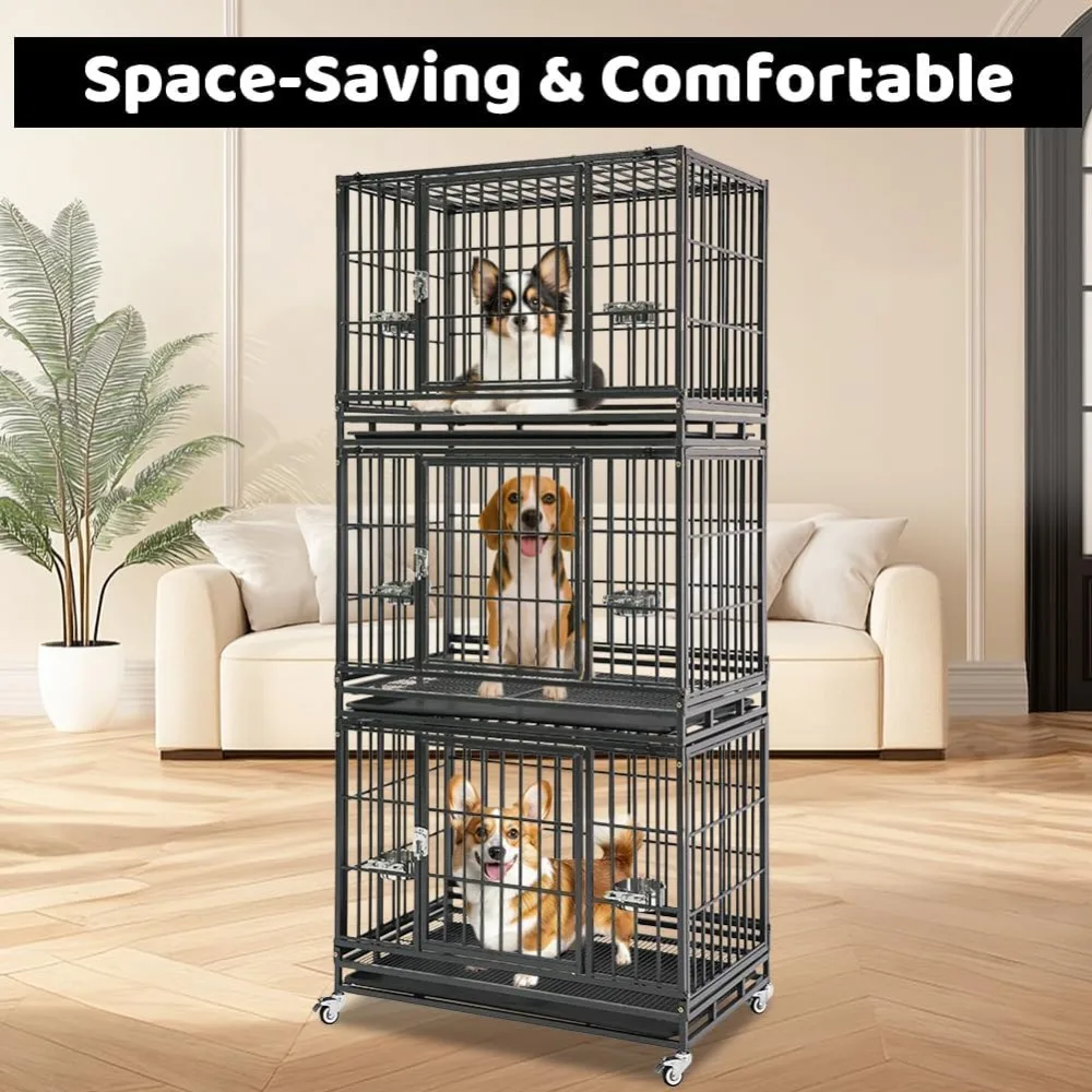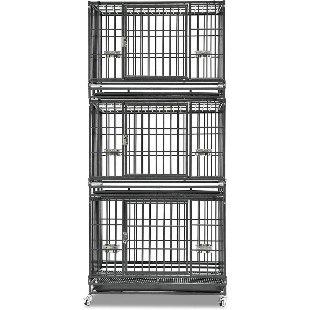 - Dog Crate Bank: Includes: Three tiers stackable dog crate(Size: 37"L x 22.5"W x 82"H). Each unit comes with 1 x Tray, 2 x Metal Floor Grids, 4 x Locakable Casters, 1 x Safe Locks, 2 x Steel Feeding Bowls (Food & Water). Perfect dog crate cage kennel for medium small dog breeds. Choose spacious dog kennels keep your dog's comfort and safety